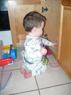 Aidan has officially learned how to get into our cuboards! LOL! I'm not too concerned, we have locks on the ones he shouldn't be in. He had a ball throwing my tupperware all over the kitchen. He also enjoyed dragging his toys over and outting them in the cuboard! I love this age :)